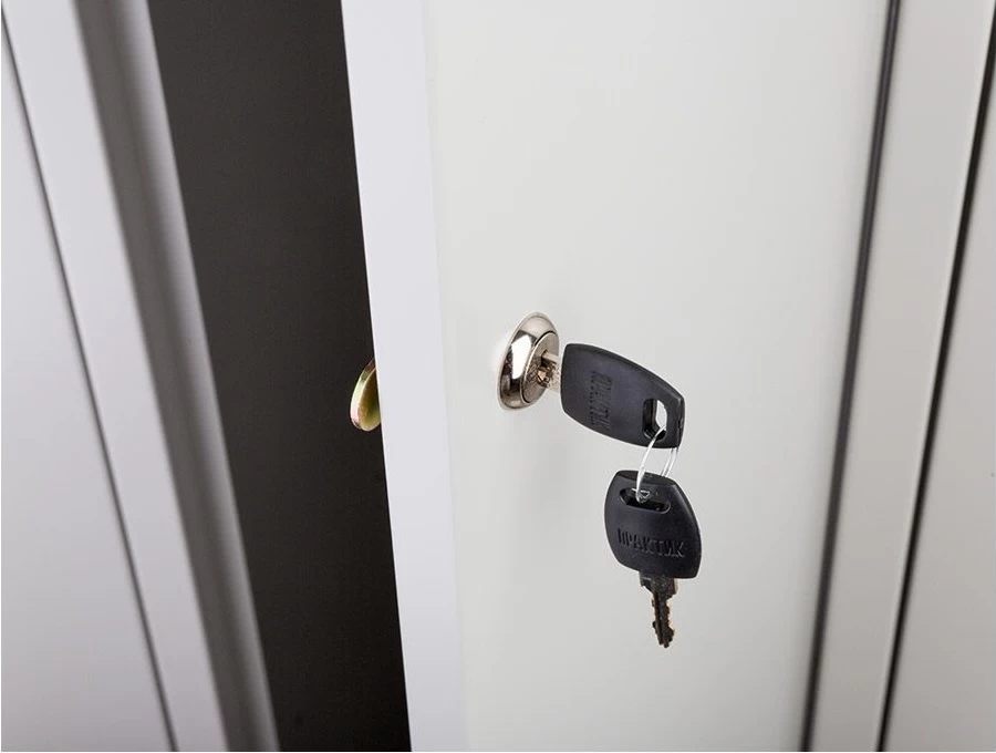 На шкаф МД LS (LE)-21-60 U устанавливаются ключевые замки «Практик» (2 000 комбинаций) с возможностью смены цилиндра и мастер-ключом. На заказ возможна установка бесключевого замка Euro-locks A129 с устройством под навесной замок.